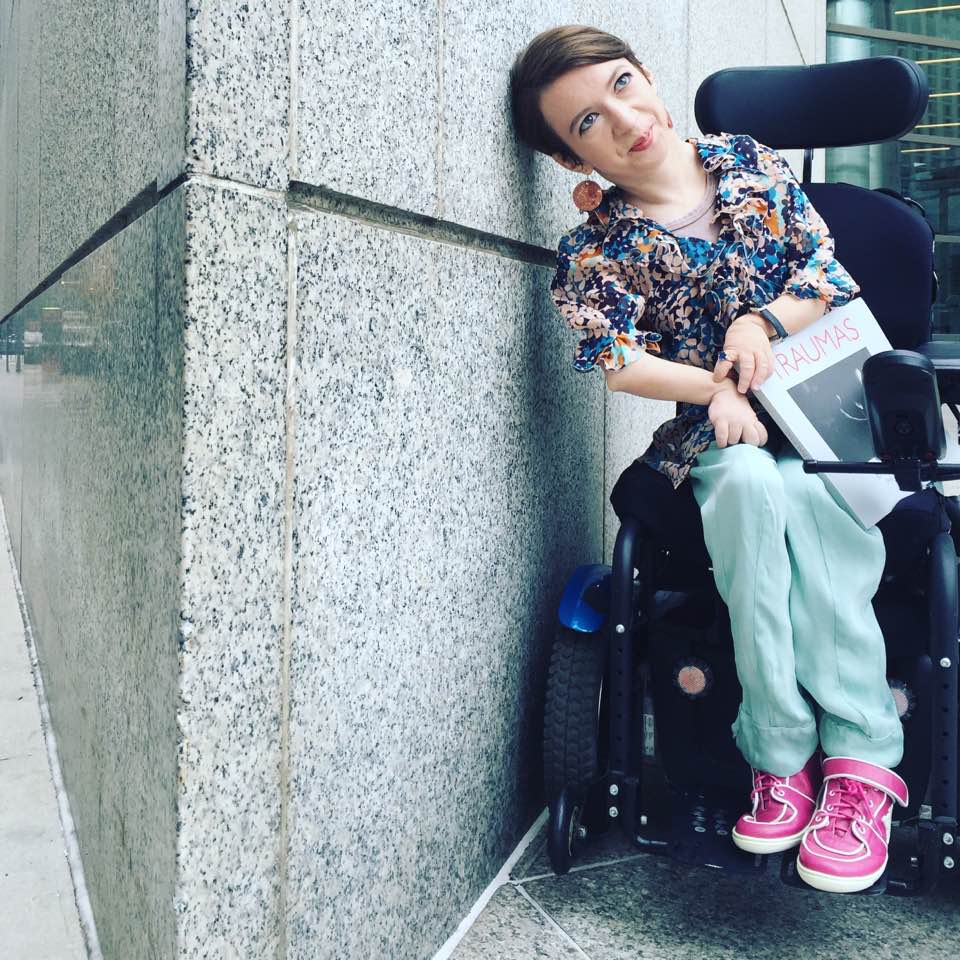 [Description of image below: Kristina is sitting in an electric wheelchair, staring upwards, her head resting on an exterior wall of a building. A book of photography called Traumas sits on the chair, resting on her left side. From the photoshoot, Fashioned. Photo credit: Hugh Trimble.]