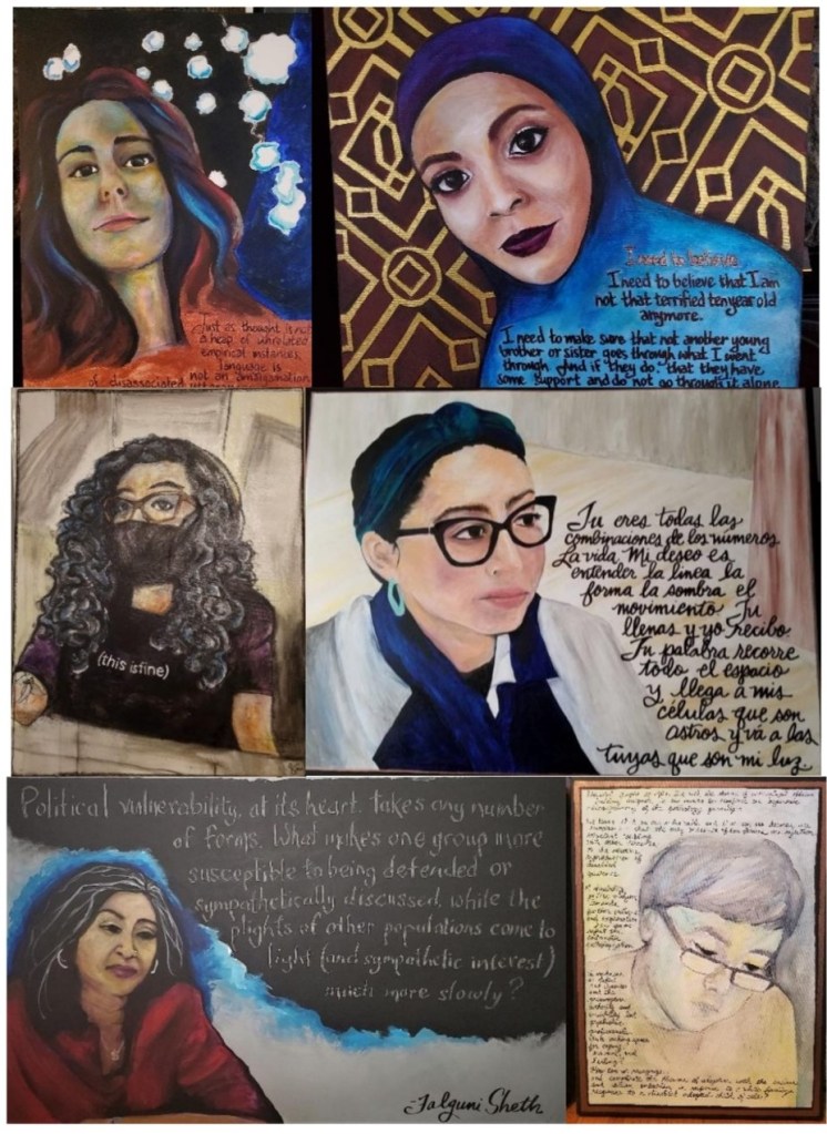 [Description of image below: Six different portrait paintings of varying media, each portrait image includes text. Top left: Becca Longtin; top right: Tazmin Haque Uddin; middle left: Marjorie Hooven; middle right: Michelle Jammes; bottom left: Falguni Sheth; bottom right: Lydia X.Z. Brown.]