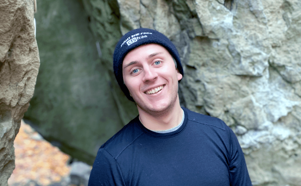 [Description of photo below: Alex, who is smiling widely, wears a toque on which is stenciled “FIGHT THE FEES” and “cfsfcéé,” the acronym for the Canadian Federation of Students/Fédération canadienne des étudiantes et étudiants. With his head tilted slightly to his right, Alex stands in front of large boulders of the Niagara Glen near Niagara Falls dressed in a t-shirt on top of another t-shirt.]