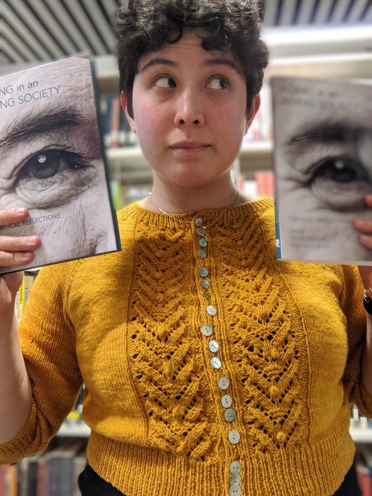 [Description of photo below: Élaina, who has short dark hair, is wearing a bright-coloured cardigan and looking playfully to her left, while standing in a library and holding up a hardcover copy of Aging in an Aging Society (to which she contributed) in one hand and a paperback copy of the book in the other hand.]