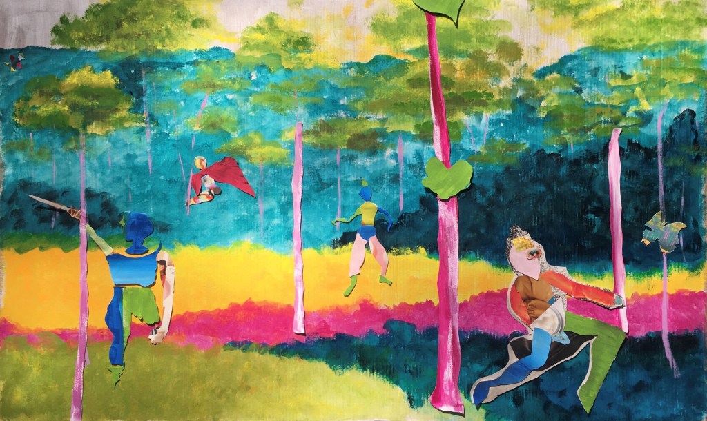 [Description of image below: the watercolour collage depicts a coloured forest scene with hills and water, tree trunks, and fields of groundcover and includes five collaged creatures, three standing with one arm raised, and one of which has an amputated lower leg and a sword; and two flying creatures, one with wings, a head and torso, and a left thigh.]