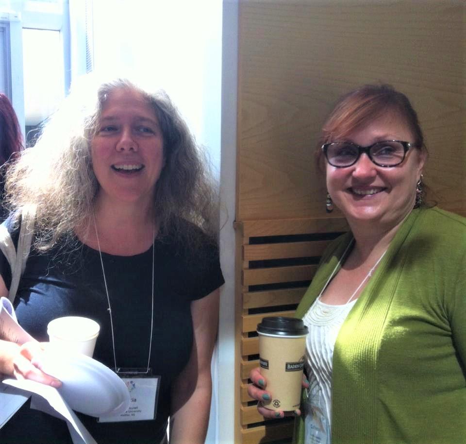 [Description of photo below taken at the fifth meeting of FEMMSS, held at the University of Waterloo (2014). Letitia (left) and Cate (right), lean against a wall during a coffee break, as if conspiring. Letitia, who has grey hair and is smiling, holds a paper cup, paper plate, a piece of paper. Cate, with her signature red hair, is wearing glasses and holding a paper coffee cup. Both of them are looking at something to their left and seem to be sharing a joke.]