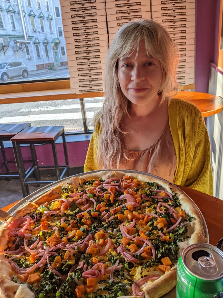 [Description of image below: Amelia is sitting in a restaurant with a large colourful pizza in a tray on the table in front of her. She is looking directly at the camera and smiling. In the background of the shot, a city street can be seen through a window, a counter that runs the length of the window, two stools below the counter, and a table in the corner of the room.]