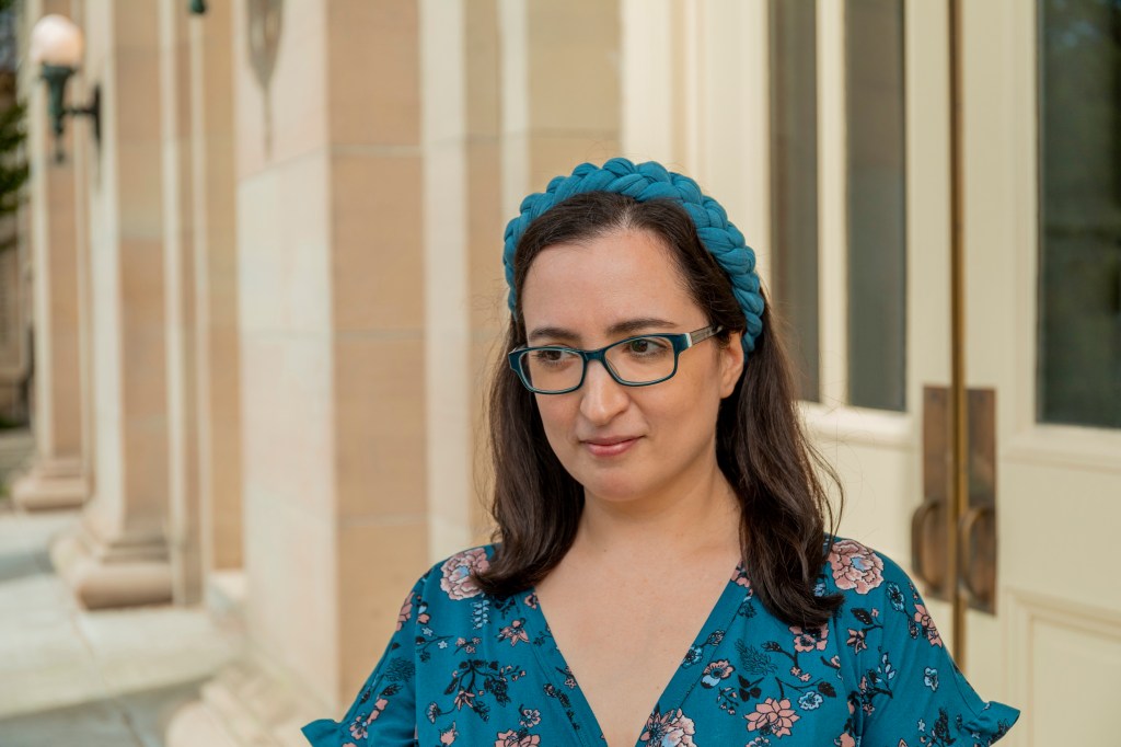 [Description of photo below: Kate, a white, small fat, cis woman, stands in a hallway in front of large doors. She is wearing a flowered dress, a braided hairband, and glasses, and smiling.]