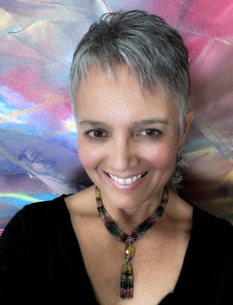 {Description of image below: photo of Tracy Isaacs, a brown-skinned mixed-race woman with short grey hair. She is smiling widely and wearing a fantastic multi-strand beaded necklace.]