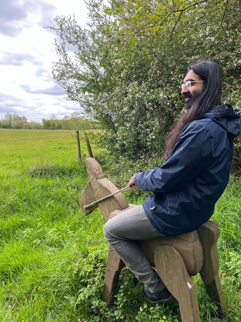 [Description of photo below: Dannish, who has long dark hair, a beard, and a moustache, and is wearing glasses and a rain-jacket, sits on a wooden horse in a field of tall grass, looking to his left. Trees can be seen in the background of the shot.]