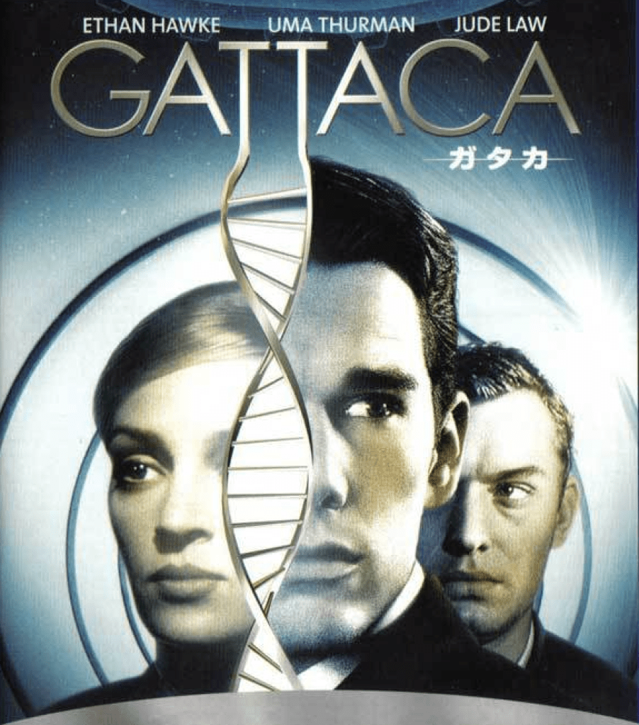 Pictured above is the Gattaca movie poster, featuring three characters in a triangular arrangement. In the foreground is Ethan Hawke (playing Vincent), a white man with short, dark brown hair. To the left is Uma Thurman (Irene), a white woman with straight blonde hair in a ponytail. To the right is Jude Law (Jerome), a white man with short, light brown hair. All characters have a serious, determined expression. A large, glowing DNA double helix stretches vertically in front of them. The colour scheme is muted, clinical shades of blue, gray, and white. The title “GATTACA” appears near the top in silver letters, connecting with the DNA helix. There are Japanese katakana characters (ガタカ) under the English title.